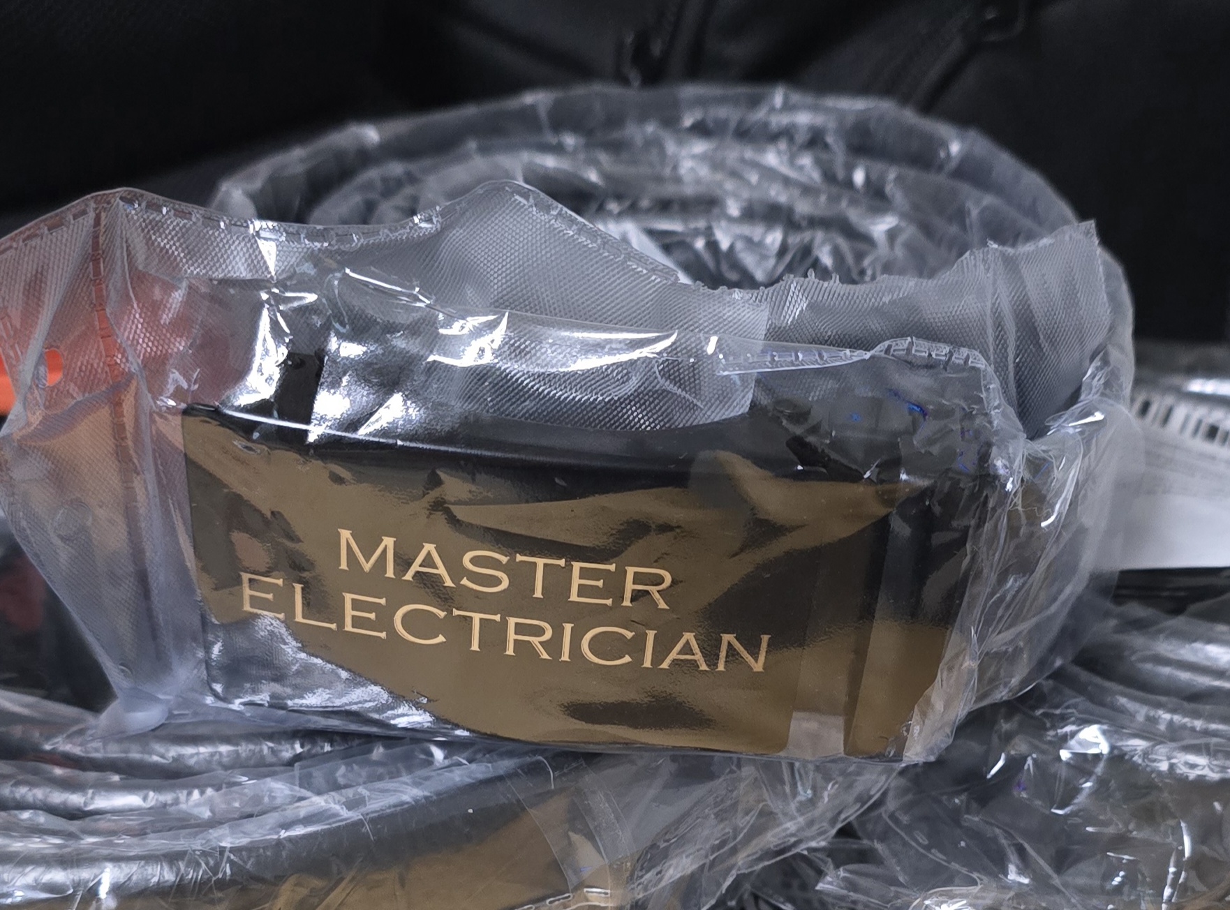 We have a great simple click belt for our members with Master Electrician on it. PU belt with aluminum clasp and click Tightening style. Size is 120cm. Ideal for waists 34 to 38 inches (maybe 40).