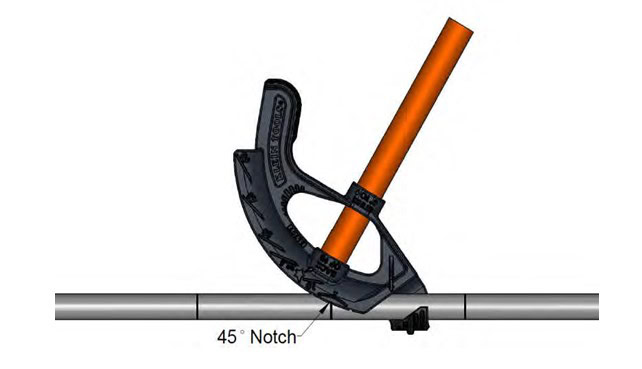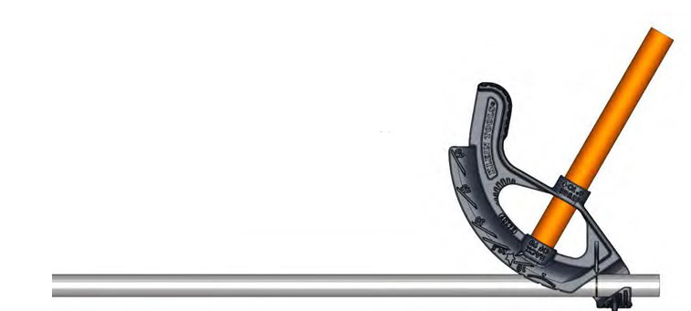 7. The second bend of the offset is accomplished by performing an air-bend. Make sure the handle hilt is secure on ground and is reinforced by your foot so it does not slide out. Make sure you are balanced and apply force close to the tool and your body controlling the tubing as you bend it around the bender’s cradle. Bend the free end until the 45° mark is reached.