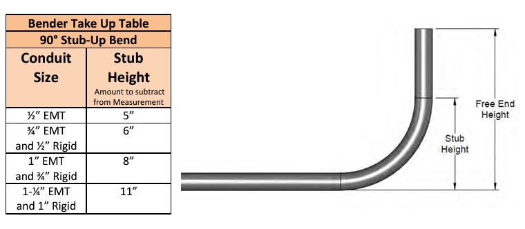 2. From the overall free height, subtract the stub height listed in the Bender Take-Up Table for the raceway size you are bending. Klein Tools has provided the correct stub height on each bender head.