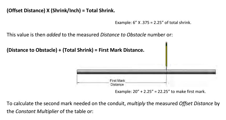 3. From the table use the 45° X 45° offset row for the values to calculate the series of markings necessary to make the proper bend. To find out where to place the first mark on the raceway, multiply the measured Offset Distance to clear the obstacle by the tables Shrink/Inch that will occur to the raceway after all the bends are made due to that offset distance or: